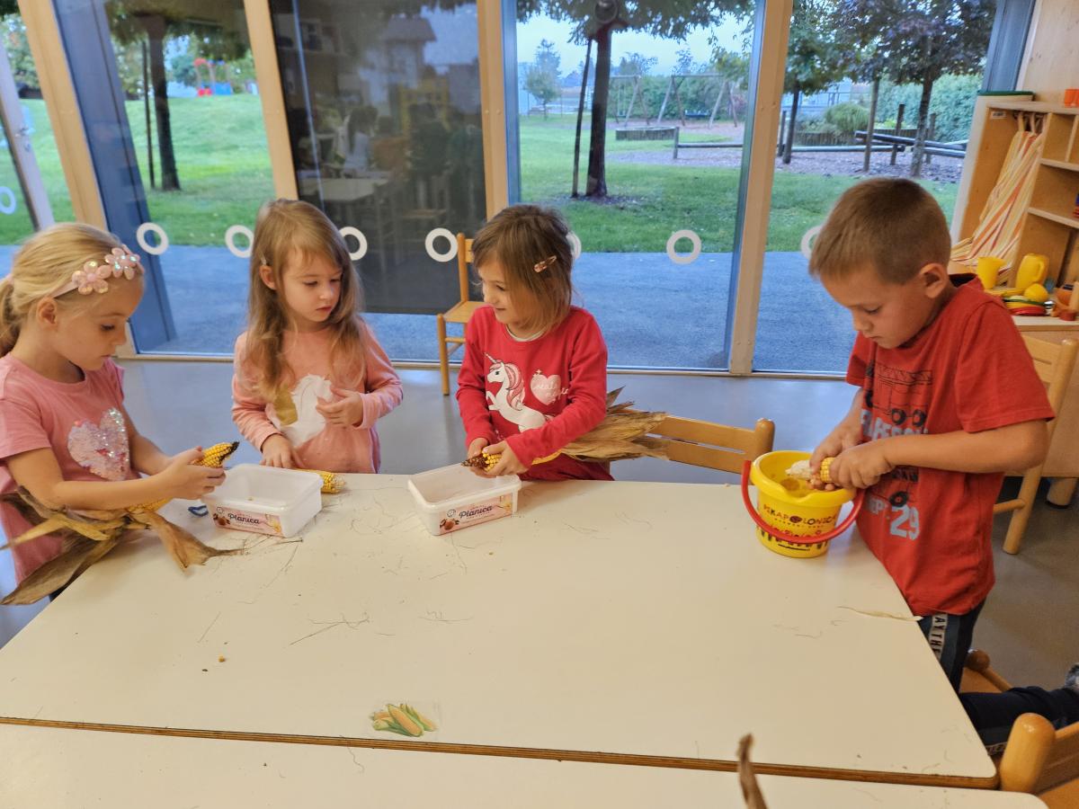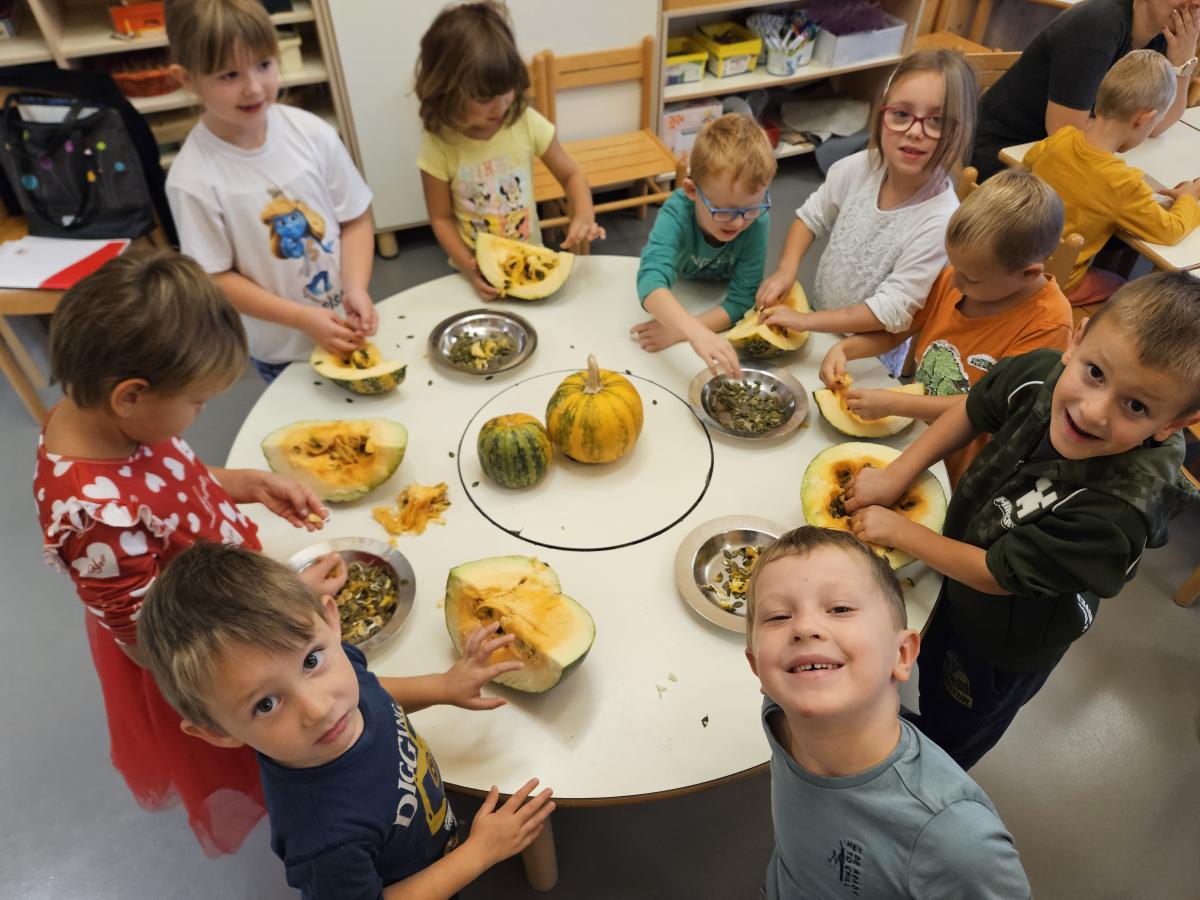 Jesen nas je obdarila z različnimi jesenskimi pridelki in plodovi ter nam hkrati dala možnost spoznavati stara kmečka opravila, kot so luščenje fižola, koruze in trebljenje buč. S tovrstnimi dejavnostmi smo spoznavali, kako spretni in hitri so naši prstki, ter svoje ročne spretnosti še razvijali. Ugotovili smo, da je ročno trebljenje buč oziroma pobiranje semen iz buče kar zamudno in zahteva kar nekaj spretnosti. Semena smo uporabili za igro in likovno ustvarjanje. V jesenskih dejavnostih smo uživali.